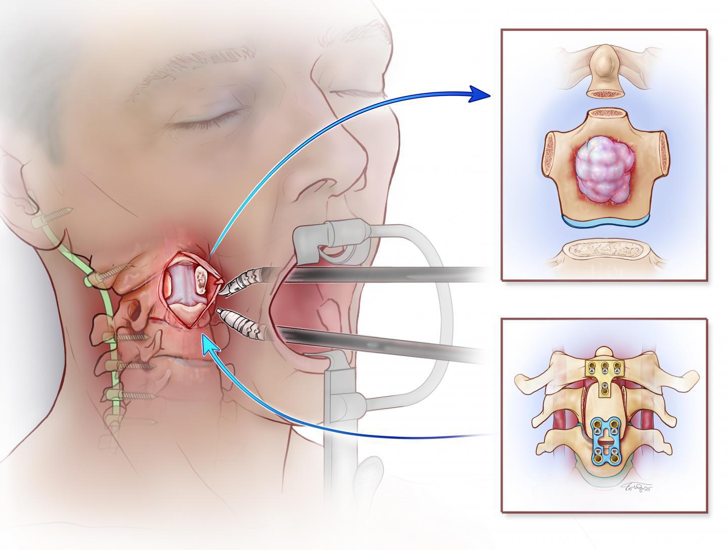 Due to the tumor’s location, there was a risk that the surgeons could paralyze Pernikoff or fail to remove the whole tumor, causing it to grow back more aggressively. They opted to utilize a trans-oral robotic approach (TORS), a minimally invasive technique invented at the University of Pennsylvania. In the first phase of the operation, the surgeons cut the spine around the tumor. In the second part, the surgical robot cleared a path so the surgeon could remove the whole tumor through the patient’s mouth. In the final stage, the surgical team reconstructed the spinal column using rods and some bone from the patient’s own hip.