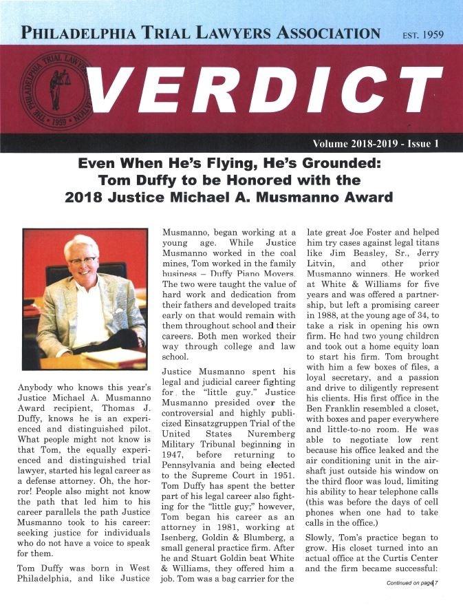 Anybody who knows this year's Justice Michael A. Musmanno Award recipient, Thomas J. Duffy, knows he is an experienced and distinguished pilot. What people might not know is that Tom, the equally experienced and distinguished trial lawyer, started his legal career as a defense attorney. Oh, the horror! People also might not know the path that led him to his career parallels the path Justice Musmanno took to his career: seeking justice for individuals who do not have a voice to speak for them.