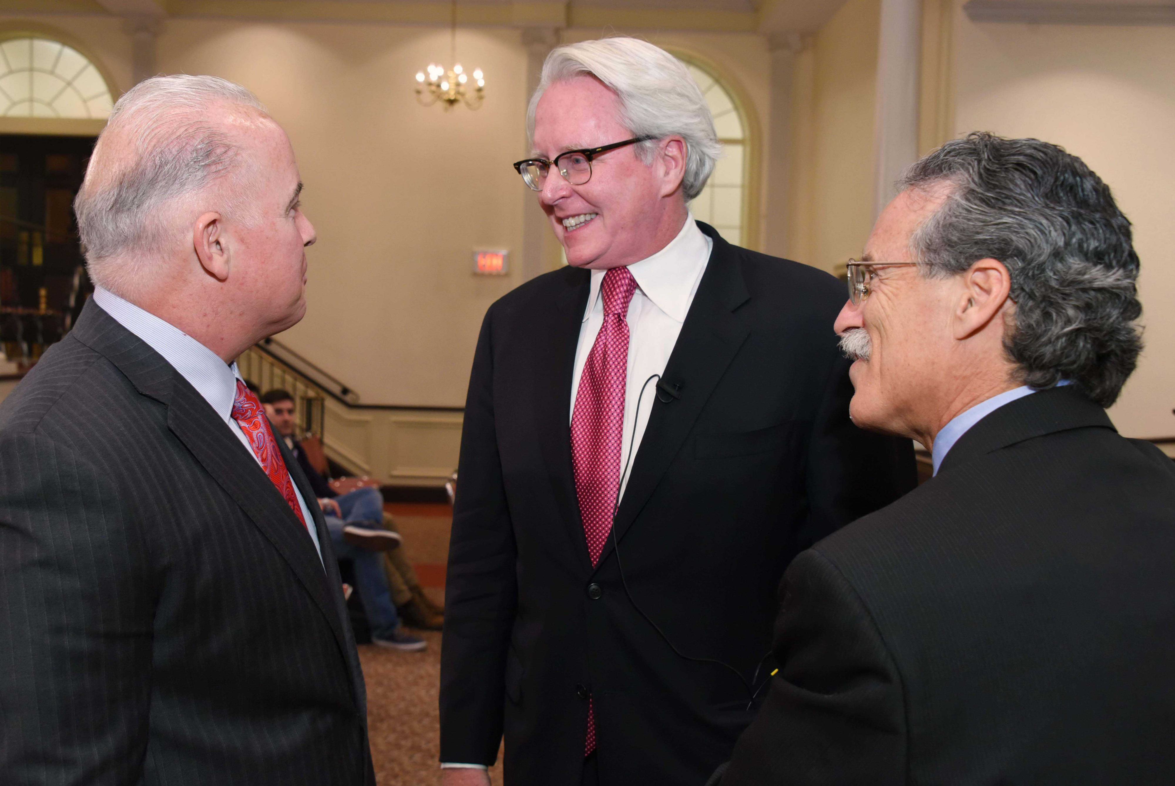 Tom Duffy, center, is congratulated after the 2016 Kolsby Lecture by the Honorable Daniel D. McCaffery of the Philadelphia Court of Common Pleas (left) and Jules Epstein, Professor of Law and Director of Advocacy Programs at Temple University Beasley School of Law.