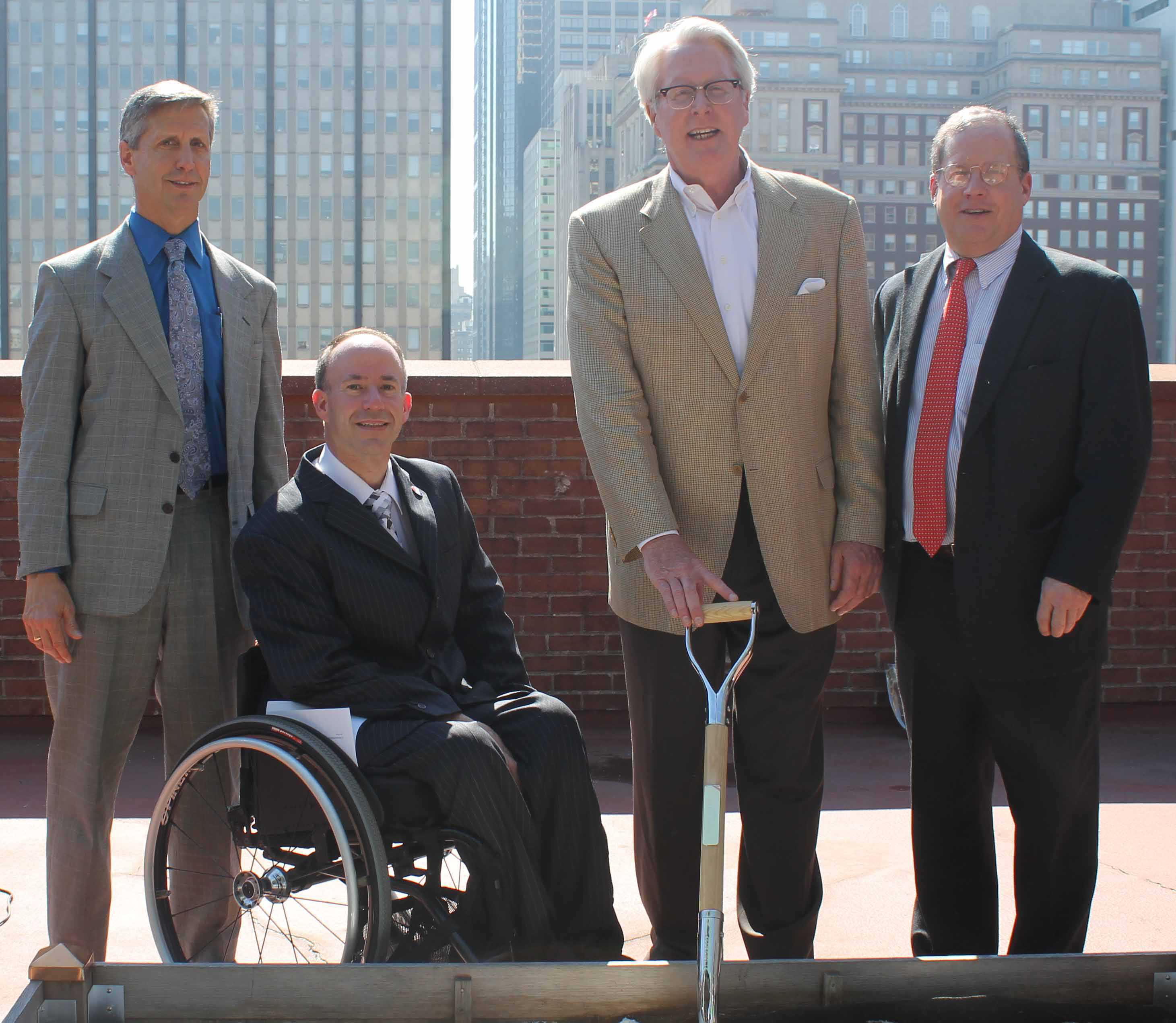 Tom Duffy, second from right, joins representatives from Magee Rehabilitation Hospital Foundation at the groundbreaking for the Creative Therapy Center and Healing Gardens (from left): Ron Siggs, Vice President, Development and Public Relations; Mark Chilutti, Assistant Vice President of Development and Bill Conrad, Chairman of the Board.