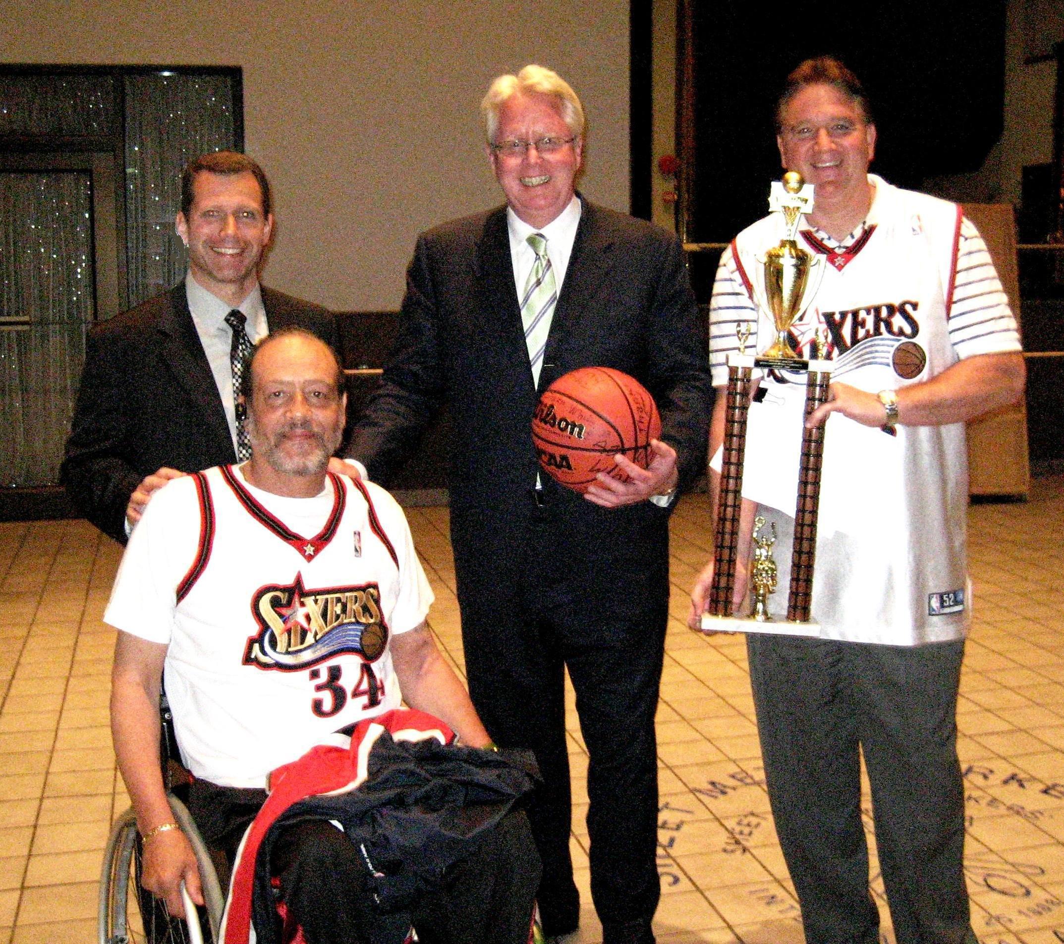 Supporters of the program, including "Sixers Spokesmen" coach Joe Bradley (seated) and assistant manager Jim Falls (holding trophy) presented Tom Duffy with a team-autographed basketball from a recent championship game in thanks for their ongoing support of the Wheelchair Sports League program.